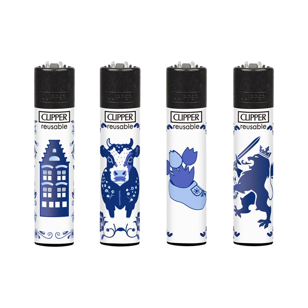 The Clipper Premium Delft Blue Lighters Display blend classic Dutch design with the quality and reliability Clipper is known for. Each lighter features a blue and white illustration inspired by traditional Delft pottery, including Dutch houses, cows, clogs, and heraldic symbols. The result is a clean, stylish collection that stands out with a strong cultural identity.