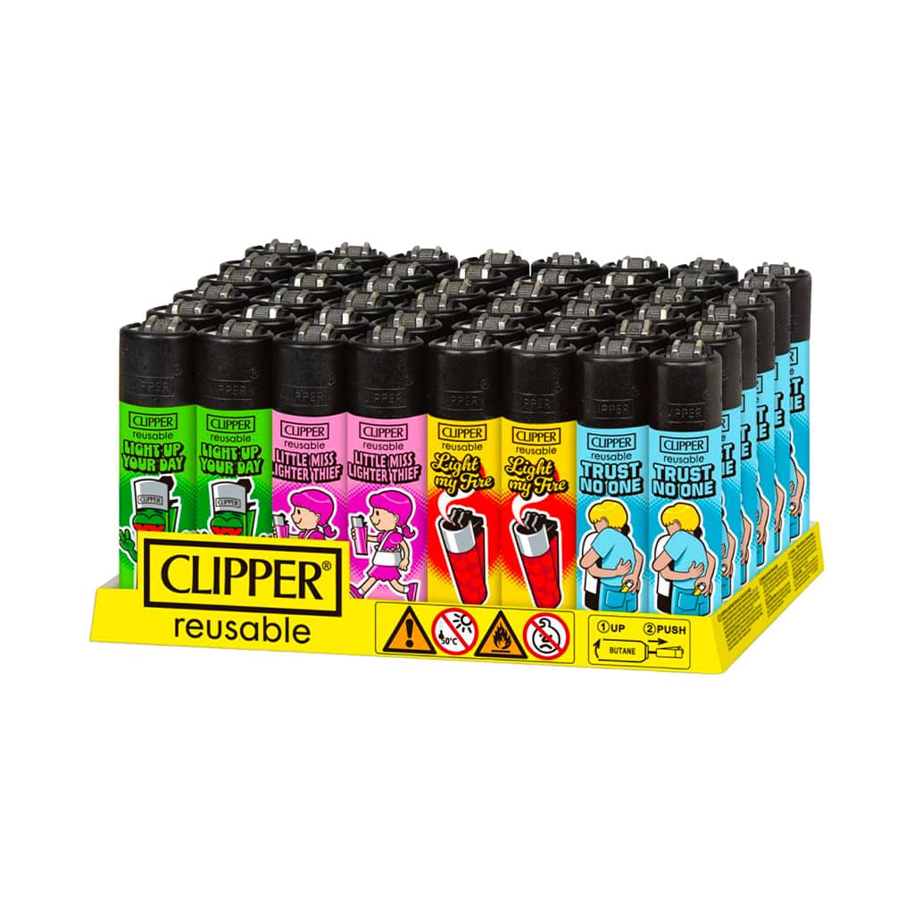 The Clipper Premium Fans Lighters display brings humour, vibrant colours, and character driven artwork into a reusable and durable Clipper design. Each lighter features a playful illustration with a fun slogan, giving the set strong personality and instant shelf appeal. The mix of bright colours makes the display eye catching and ideal for customers who enjoy bold and expressive accessories.