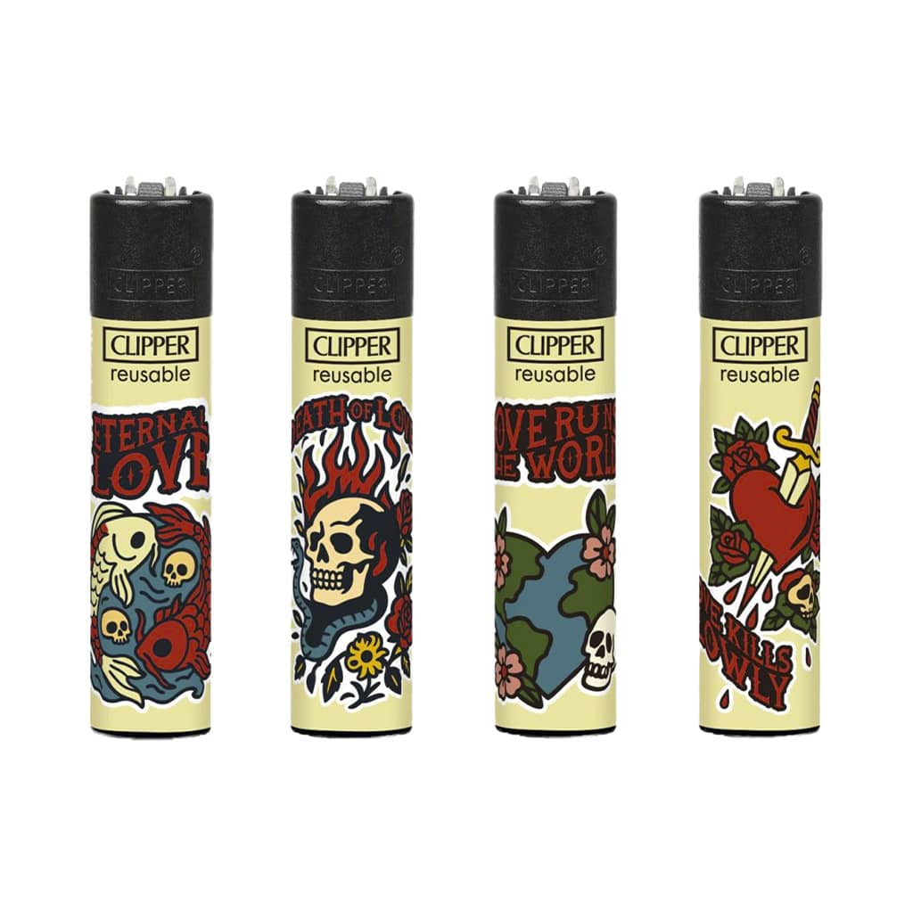 The Clipper Premium Smoking Lighters – New School Skulls showcase striking, tattoo-inspired artwork featuring skulls, roses, flames, and bold outlines. Designed in a modern new school style, these lighters combine edgy visuals with strong color contrasts, making them instantly eye-catching at the point of sale.