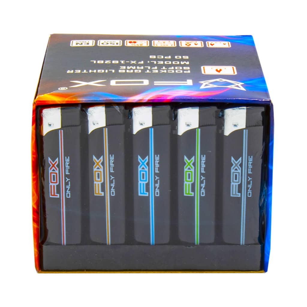 The Fox Lighters – Black Piezo blend timeless black with striking neon accents. This pack of 50 lighters includes five bold colors—red, orange, blue, green, and white—each set against a deep black body for maximum contrast. The result is a sharp, modern design that feels edgy, fun, and cool. These lighters stand out in any display, making them an attractive choice for shelves or counters.