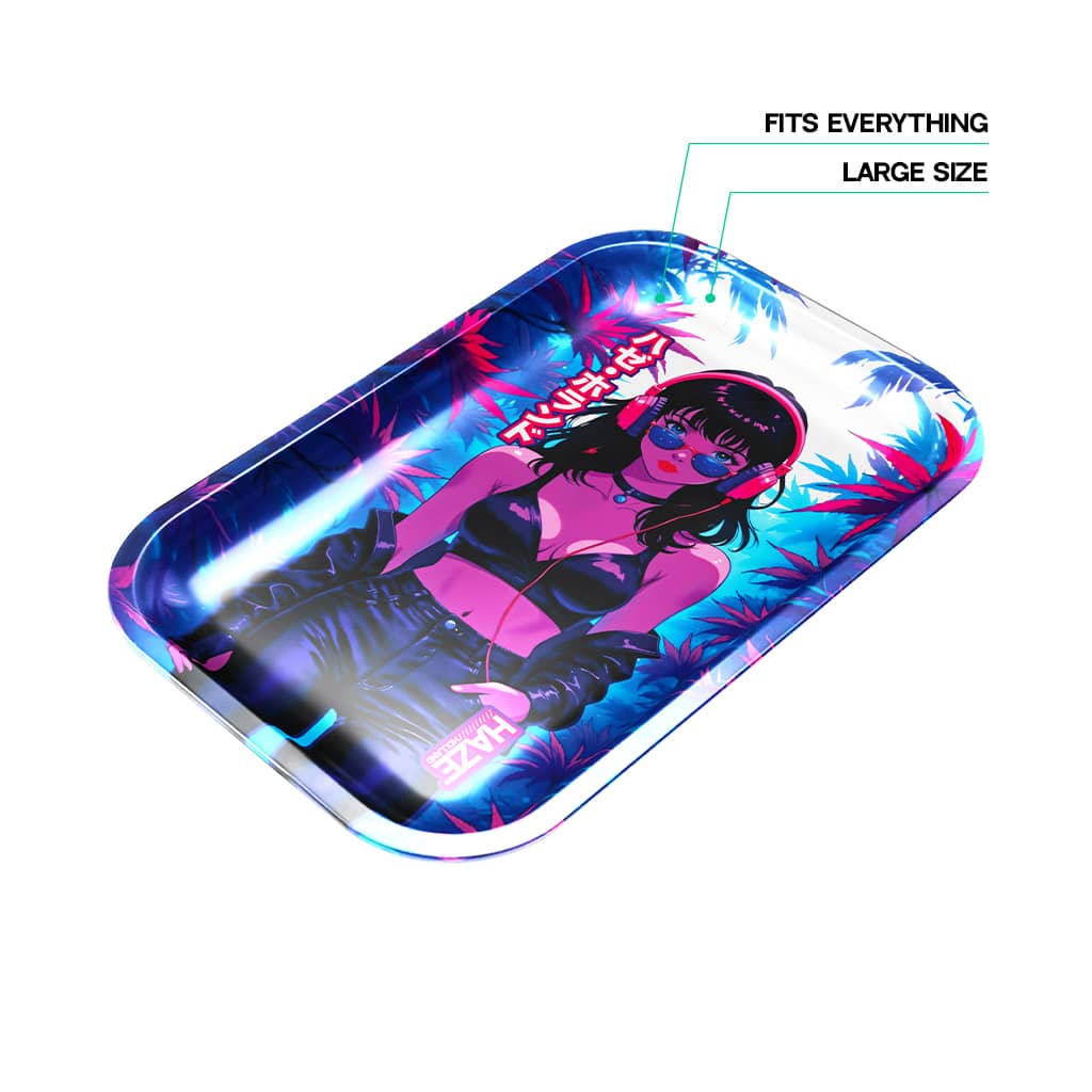 Ayame has that look that cuts straight through the noise. Cool shades, wired headphones, jacket slipping off her shoulders with zero hesitation, and a stare that says she has already read the whole room. The Haze Holland Metal Rolling Tray Ayame, from the Anime line drops you into a neon jungle of bright blues, sharp pinks, and deep shadows. She stands right at the center, calm and in control, as if the whole scene bends toward her. She is stylish, confident, and impossible to overlook. This tray brings that energy into your ritual with colors that pop, attitude that stays, and a presence that transforms your setup the moment you place it down.