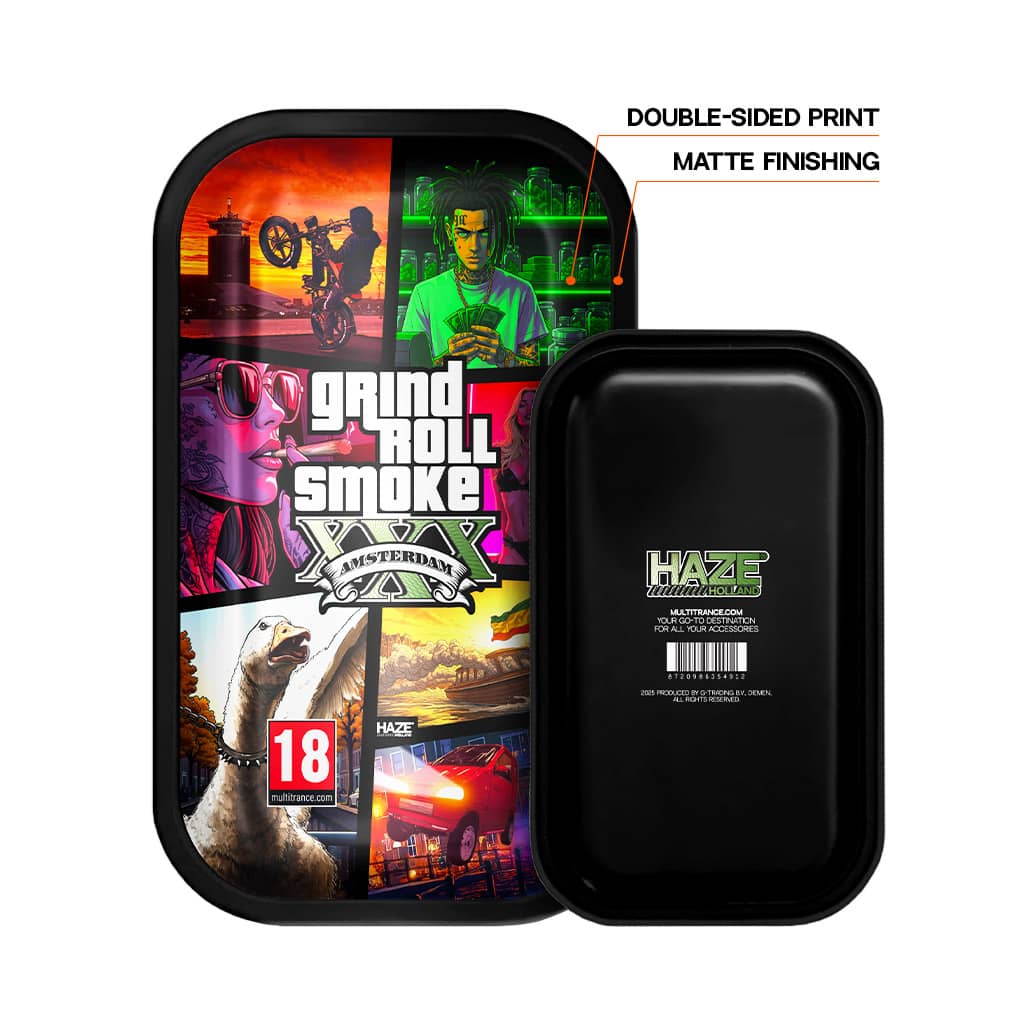 Grind, Roll, Smoke V drops you straight into an Amsterdam that runs on pure adrenaline, a city where every corner is a mission and every choice can send you straight into wasted mode. Bikes turn into stunt machines, coffeeshops feel like headquarters, and the streets carry the pulse of chase scenes, street deals, and late-night bravado. This gaming rolling tray blends high-speed city grit with the unfiltered personality of the Lowlands Madness: loud characters, wild encounters, bad decisions, good smoke, and the kind of chaos that becomes a story the moment it happens.