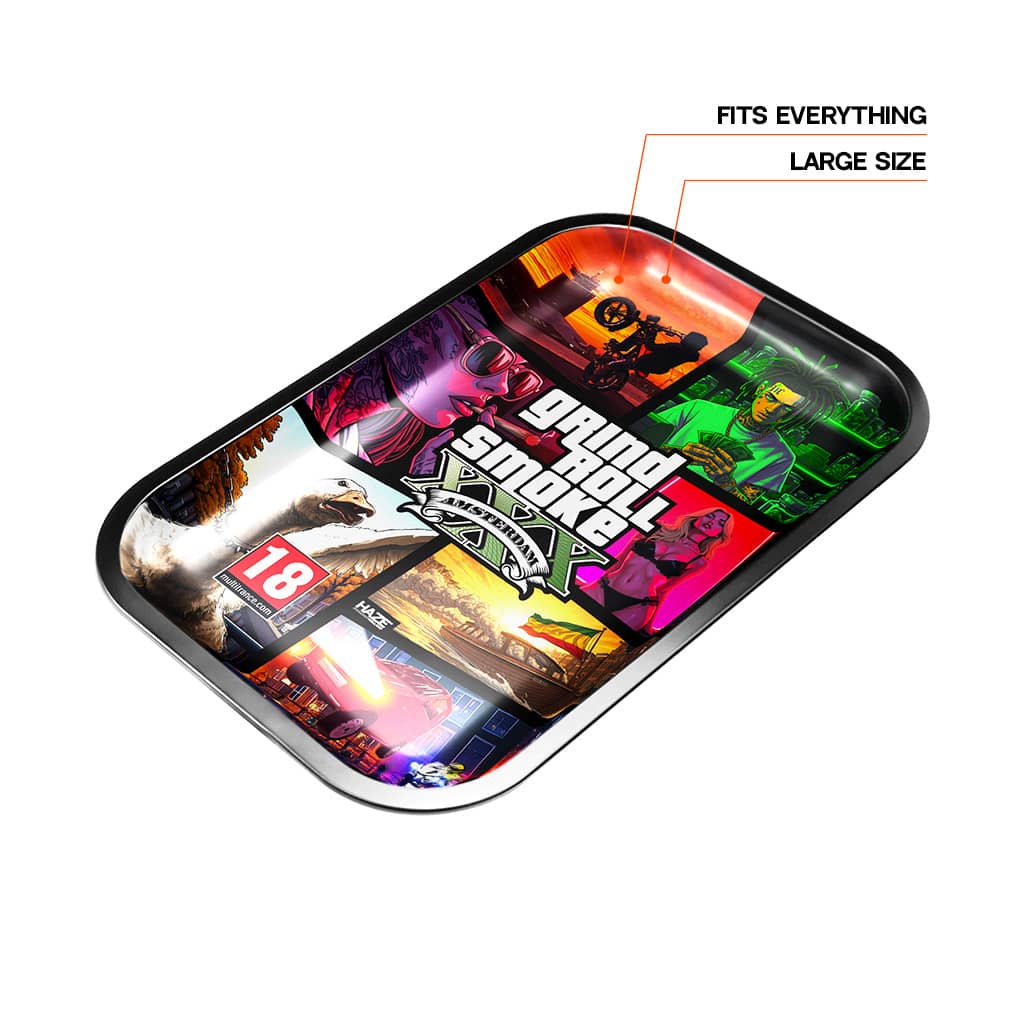 GRS V is Amsterdam turned into a playable vibe: bold, reckless, hilarious, and fully loaded into a large gaming rolling tray built for action.