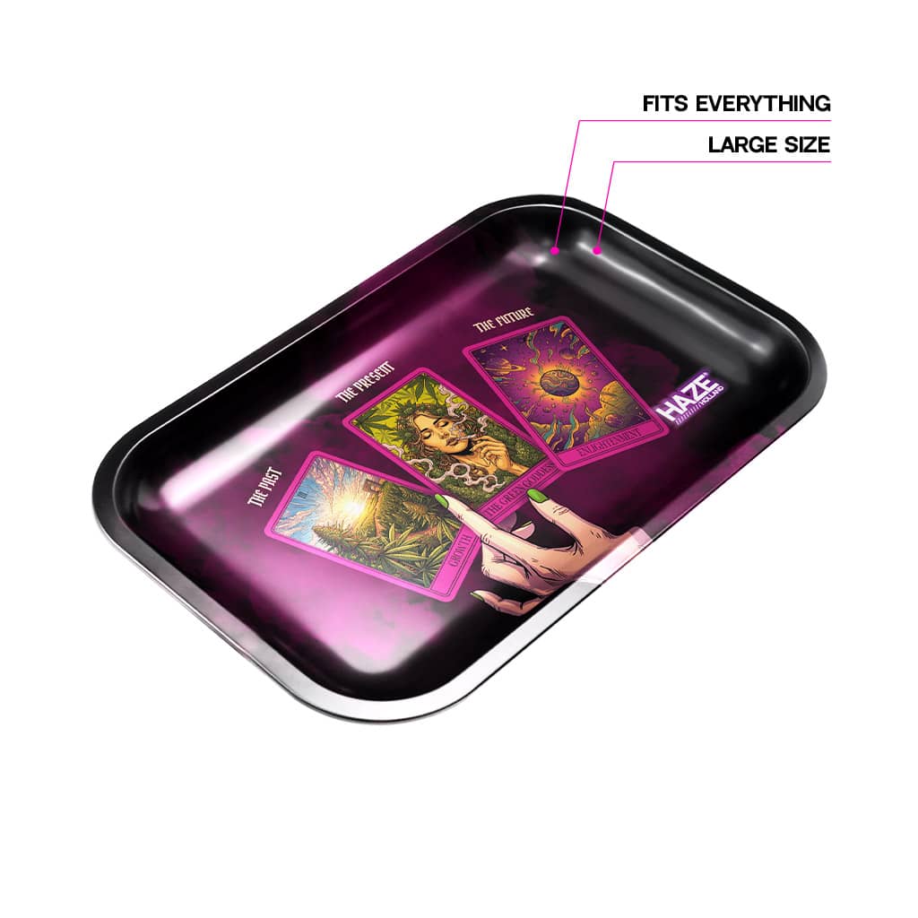 Hazey Prophecy is the tarot spread you stumble on at the perfect time. Three cards, floating in a pink haze, laying out your whole journey with zero hesitation. The Past? Growth. The Present? The Green Goddess lighting up. The Future? Cosmic-level enlightenment. The kind of spread that shows up exactly when you need a cosmic nudge. The hand hovering in the glow is ready to pull another card, but honestly, the universe has said enough. The Haze Holland Pink Rolling Tray showing this Hazey Prophecy mixes mystic symbolism with a playful wink, turning your ritual into a moment that feels guided, aesthetic, and just a little bit destined. It is magic with attitude, wrapped in pink.