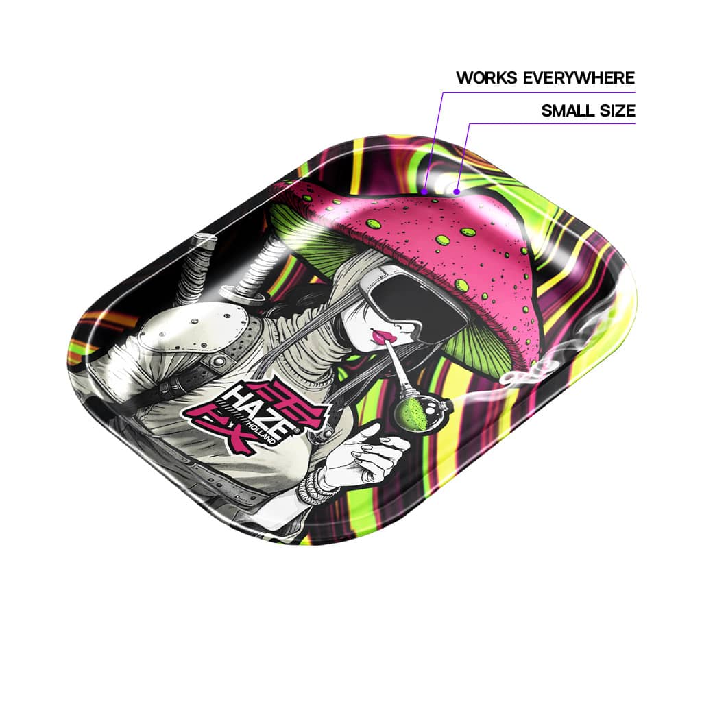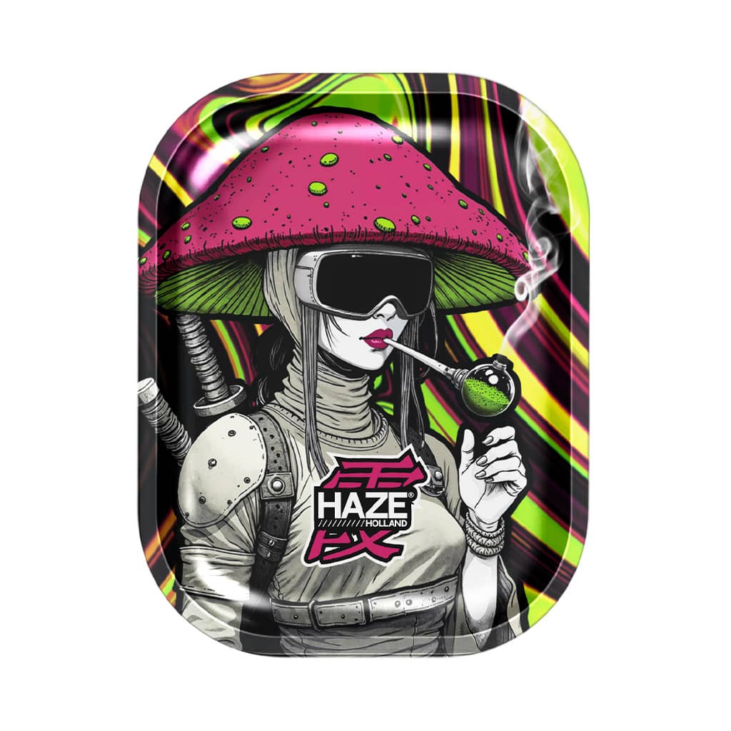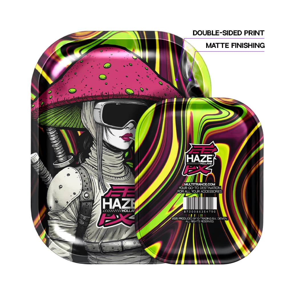 Shroom Ninja trained in a dimension where structure never made it past day one. Oversized mushroom cap, visor blocking everything but her next move, armor strapped tight, and a glowing orb pipe ready in her hand. The Haze Holland Metal Rolling Tray Shroom Ninja throws her into a swirl of neon green, pink, and black that is unstable and wild. She stands silent and focused, the type who strikes fast and disappears before you understand what happened. This small tray brings a sharp, unpredictable energy to your setup and gives your ritual a look that hits the second you see it.