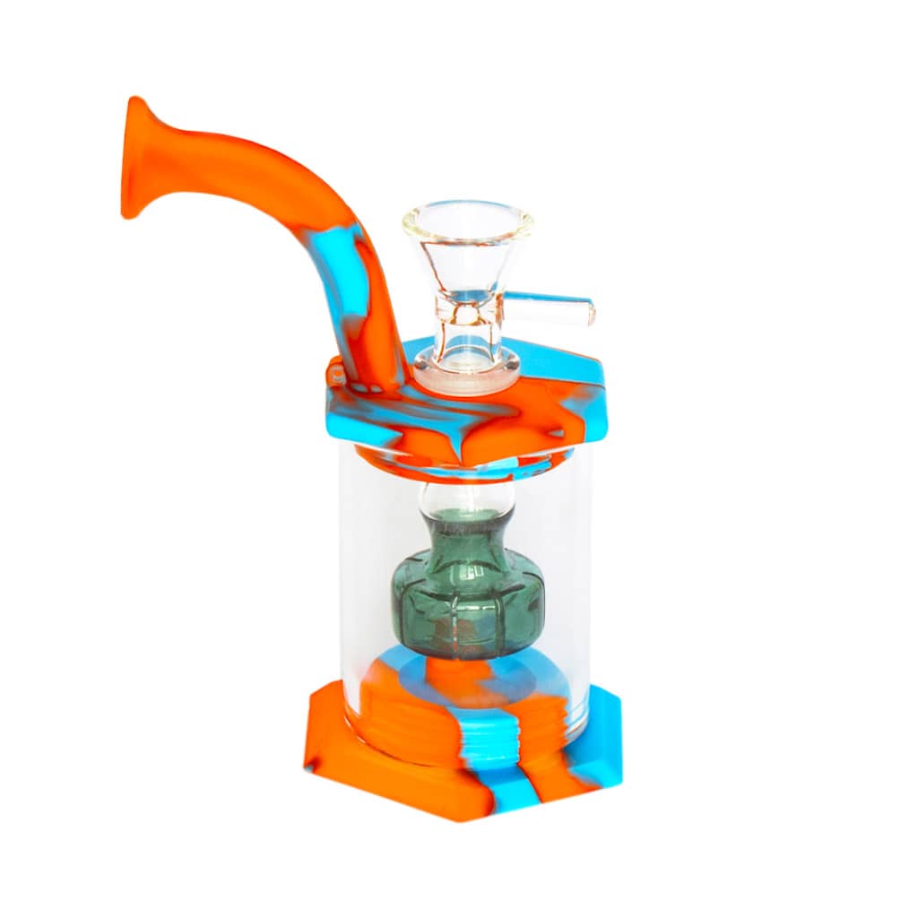 The bright orange and blue swirl gives this bong an electric, modern look that immediately draws attention. Its transparent glass chamber showcases the water filtration process, while the silicone top and base add flexibility and impact resistance. The result is a stylish and practical piece that performs beautifully while standing up to everyday use.